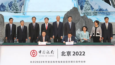 2017年7月13日,中國銀行與北京冬奧組委舉行簽約儀式,中國銀行成為北京2022年冬奧會和冬殘奧會官方銀行合作伙伴。中國銀行是北京冬奧組委簽約的第一家官方合作伙伴,也是北京冬奧組委市場開發計劃最高級別贊助企業,這標志著北京冬奧組委市場開發計劃取得重要進展。