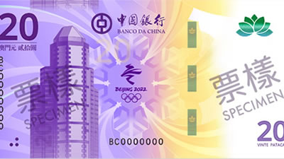 為慶祝第24屆冬季奧林匹克運動會在北京舉行,作為北京冬奧組委授權的官方合作銀行,根據澳門特區第13/2021號行政法規,中國銀行獲準發行第24屆冬季奧林匹克運動會主題澳門元鈔票。鈔票正面采用中國銀行澳門分行大廈圖案、雪花圖案及第24屆冬奧會徽“冬夢”匯聚的星星圖案,體現冬奧會的季節特征和北京冬奧精神的巨大凝聚力。