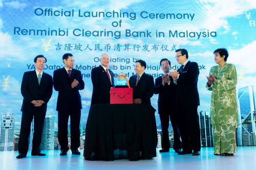 4月14日,中國銀行在馬來西亞舉行"吉隆坡人民幣清算行服務(wù)啟動儀式"。馬來西亞總理納吉布,中國銀行行長陳四清、中國駐馬來西亞大使黃惠康分別在啟動儀式上致辭,并為"中國銀行吉隆坡人民幣清算行"揭牌。馬來西亞財政部、馬來西亞國家銀行、馬來西亞證監(jiān)會、馬來西亞證券交易所、馬來西亞主要商業(yè)銀行和世界500強等逾200名代表參加。