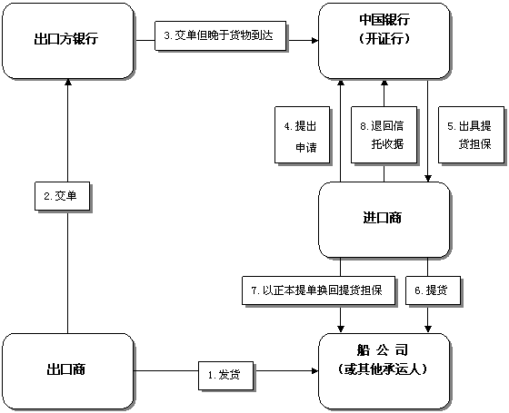 4.信用證或托收項下單據到達后,進口商向我行辦理付款贖單,然后憑正本提單向船公司(或其它承運人)換取先前出具的提貨擔保并交還我行。