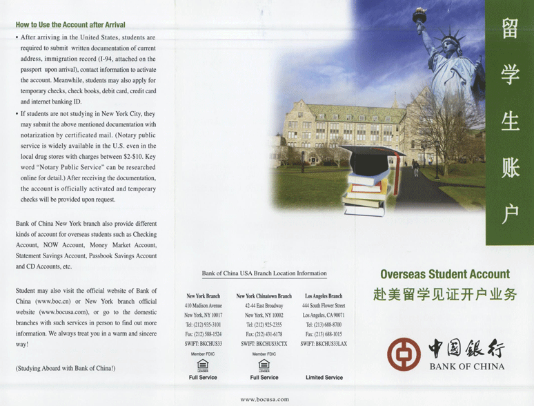 43-25 Main Street Flushing, NY11355 USA | 電話:1-212-925-2355 傳真:1-718-321-3733 郵箱:overseastudent@bocusa.com 網點詳情 >> |