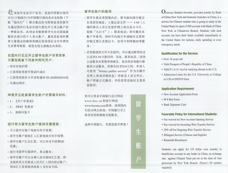 中國銀行紐約分行及紐約皇后分行為即將赴美求學的留學生,提供全新的“美好前程”留學見證開戶產品套餐。該產品套裝包括美元有息支票賬戶、銀行卡、支票、網上銀行一攬子產品服務,具備靈活的美國境內資金劃轉和支付功能。留學生可通過中國銀行境內分支機構(不含在我國香港特別行政區、澳門特別行政區及臺灣地區的分支機構)見證申請產品服務,出國前就獲得美國當地銀行卡、臨時支票、網上銀行。個人支票和銀行卡能輕松滿足大額學費支付和日常消費需求,網上銀行具備便捷查詢賬戶交易和匯款轉賬等功能,足不出戶即可輕松管理您的境外賬戶。
