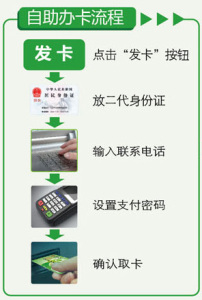 1、請(qǐng)?jiān)凇白灾l(fā)卡機(jī)”上辦理此業(yè)務(wù),辦卡時(shí)必須刷二代身份證,若持有一代身份證請(qǐng)去人工窗口或銀行柜臺(tái)辦理。