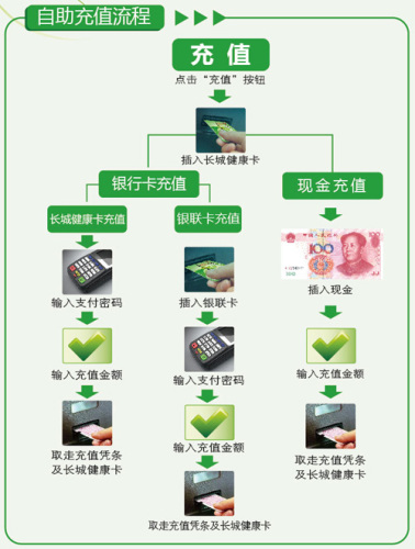 1、此流程適用于長(zhǎng)城健康卡附帶的醫(yī)院預(yù)交金賬戶充值業(yè)務(wù),若長(zhǎng)城健康卡金融賬戶充值,請(qǐng)去自助發(fā)卡機(jī)或存取款一體機(jī)。